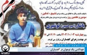 هرانا ۱۴۰۴/۱۰/۰۲ روز جاری، یک نوجوان ۱۴ ساله در شهرستان گچساران اقدام به خودکشی کرد و جان خود را از دست داد. به گزارش خبرگزاری هرانا، ارگان خبری مجموعه فعالان حقوق بشر در ایران، یک نوجوان در گچساران دست به خودکشی زد. هویت وی، یاشار (امیرحسین) نوشیری، حدودا ۱۴ ساله و اهل گچساران، توسط هرانا …