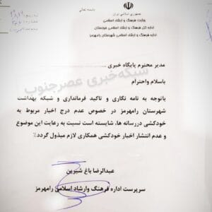 ۲۶ آبان ۱۳۹۹ فرماندار شهرستان رامهرمز از اداره فرهنگ و ارشاد اسلامی این شهرستان خواسته تا به صورت رسمی خبرنگاران محلی را از تهیه و انتشار اخبار مرتبط با خودکشی منع کند.
