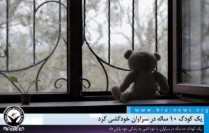 19اردیبهشت 1403 هرانا روز سه شنبه هجدهم اردیبهشت ماه، یک کودک ده ساله در سراوان، اقدام به خودکشی کرد و به زندگی خود پایان داد.