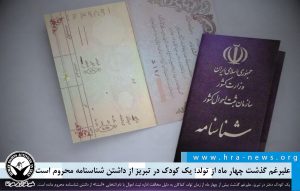 ۱۰.آذر.۱۴۰۳ هرانا اداره ثبت احوال تبریز برای یک کودک به نام «ائلشن» پس از گذشت سه ماه از تولد و شکایت والدین او به مرجع قضائی، شناسنامه صادر کرد.