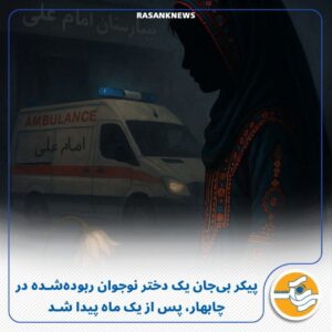 ۲۲ تیر ۱۴۰۴گروه خبری رسانک شامگاه پنجشنبه ۱۹ تیر ماه ۱۴۰۴، پیکر بیجان یک دختر نوجوان که از تاریخ ۱۹ خرداد در منطقه مرادآباد چابهار مفقود شده بود، پس از حدود یک ماه جستوجوی بیوقفه خانوادهاش، سرانجام در بیمارستان امام علی چابهار پیدا شد.