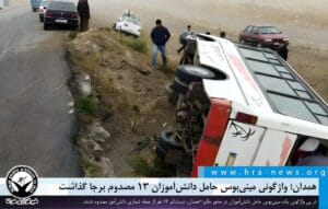 ۱۴۰۴/۰۹/۰۶ هرانا در پی واژگونی یک مینیبوس حامل دانشآموزان در محور ملایر–همدان، دستکم ۱۳ نفر از جمله شماری دانشآموز مصدوم شدند.