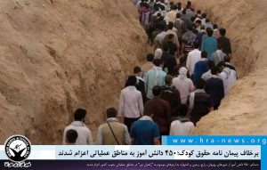 برخلاف تعهدات بین المللی ایران تحت عنوان الحاق به پیمان نامه حقوق کودک و بخش عدم به کارگیری کودکان در امور نظامی، ۴۵۰ دانش آموز از شهرهای بهبهان، سوادکوه، زارچ، زیدون و اشتهارد به اردوهای موسوم به “راهیان نور” در مناطق عملیاتی جنوب و غرب کشور اعزام شدند.