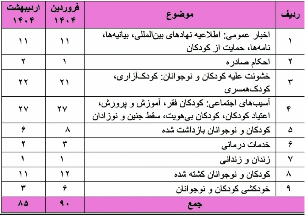 این گزارشات آماری از میان بیش از۱۰۰ خبر که در طول اردیبهشت ماه ۱۴۰۴ تهیه شده است.