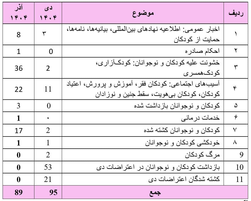 گزارش آماری نقض حقوق کودک و نوجوان،آذر ماه ۱۴۰۴
