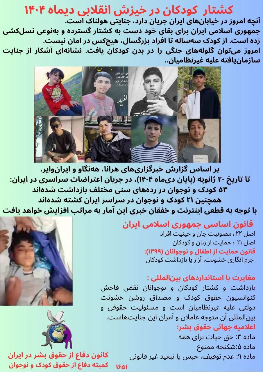 اطلاعیه ۱۶۵۱ کمیته دفاع از حقوق کودک و نوجوان با موضوع کشتار کودکان در خیزش انقلابی دیماه ۱۴۰۴