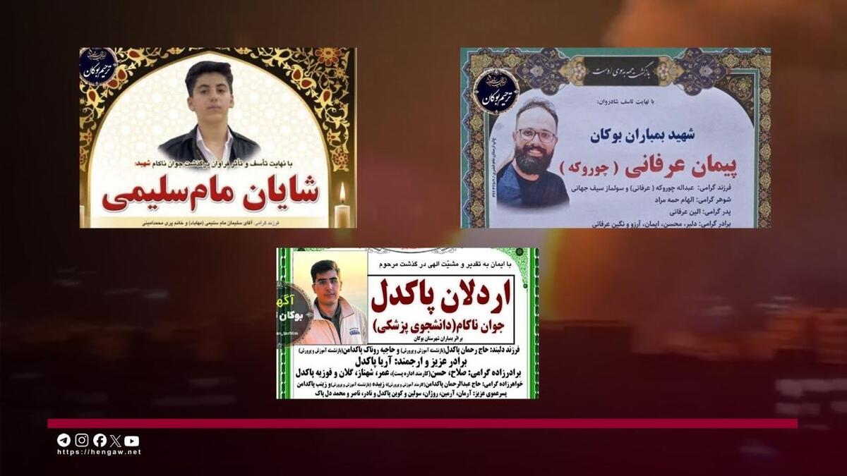 بر اساس گزارش رسیده به سازمان حقوق بشری ههنگاو، شامگاه چهارشنبه ۱۳ اسفند ۱۴۰۴، در جریان حملات جنگندههای اسرائیل و آمریکا به ساختمان فرمانداری بوکان، سە شهروند بە نامهای شایان مامسلیمی ۱۵کودک ساله، اردلان پاکدل ٢١ سالە و دانشجوی پزشکی، پیمان عرفانی ۳۰ ساله در این شهر کشتە شدند.